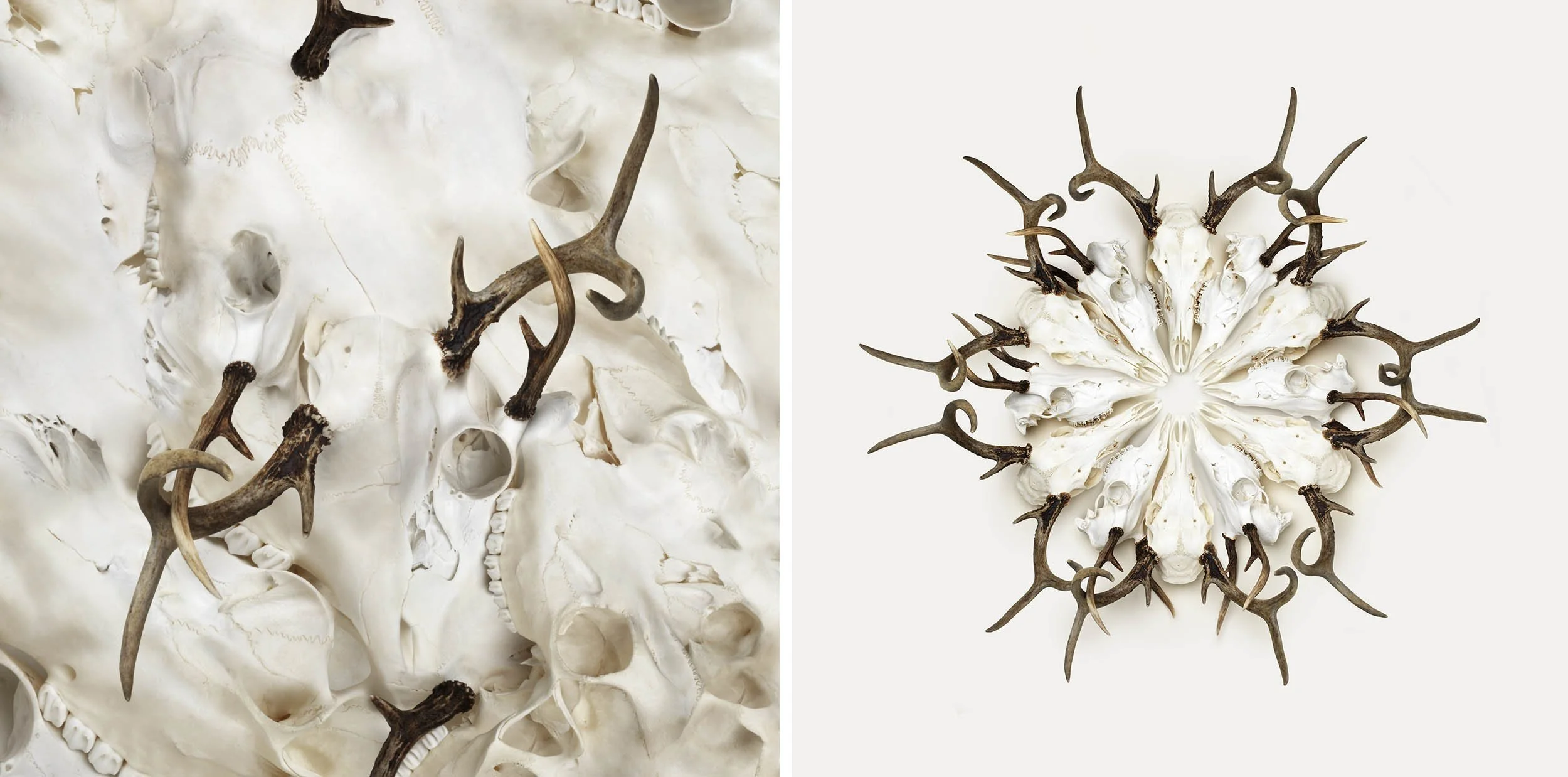 After a few discussions with Colin about the album we settled on using a skull as the main visual element as well as an idea to create patterns with the antlers. Inspired by the organic looping and repetition of his music, I photographed the skull from every angle and composited the images together to form a skull that is part fossil, part melted bone.